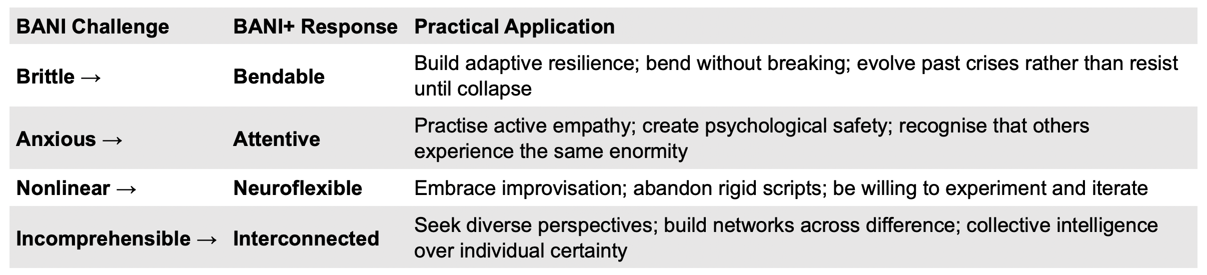 Response (How We Think): The corresponding positive frameworks - BANI+, VUCA Prime, FLUX - shift our orientation from describing problems to developing internal capacities: bendability, vision, experimental agility.